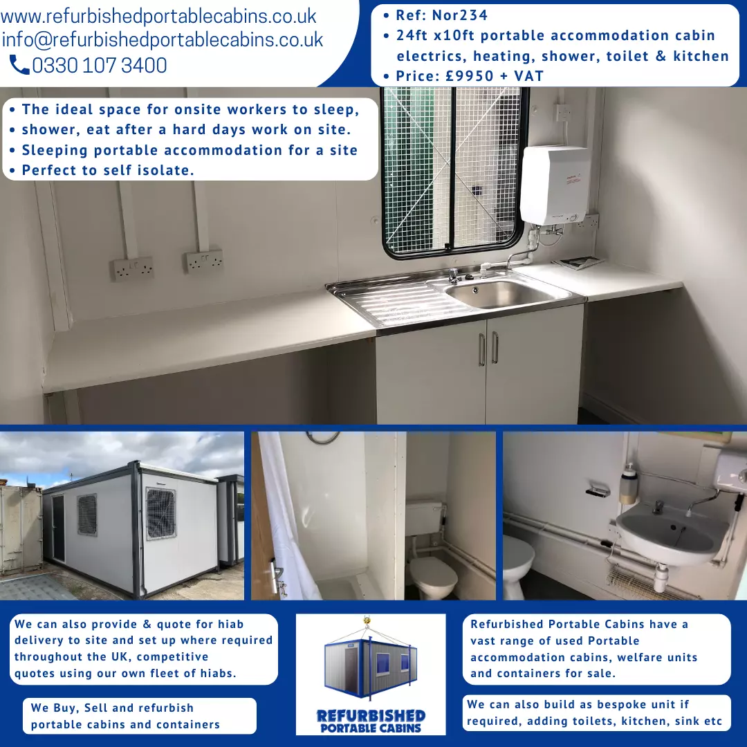 24ft x 10ft portable accommodation cabin complete with electrics, heating, shower, toilet and kitchen area.